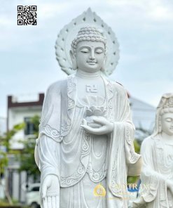 Hình tượng Đức Phật A Di Đà đứng trên đài sen, hai tay kết ấn, gương mặt hiền từ, ánh mắt từ bi soi rọi, mang đến năng lượng thanh tịnh, dẫn dắt chúng sinh về cõi Cực Lạc. Mỗi chi tiết đều được nghệ nhân làng đá Non Nước – Đà Nẵng chạm khắc tỉ mỉ, tôn vinh vẻ đẹp hài hòa giữa nghệ thuật và tâm linh.