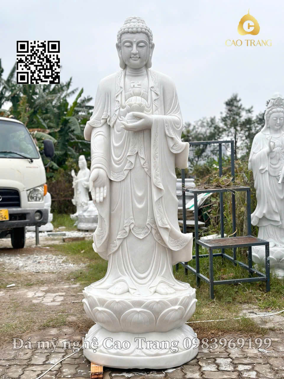 Pho tượng Phật A Di Đà cao 2m2 được chế tác theo tỷ lệ vàng của tượng Phật giáo truyền thống, dáng đứng uy nghi trên đài sen, tay kết ấn thiền định, gương mặt hiền từ, ánh mắt từ bi hướng xuống chúng sinh.