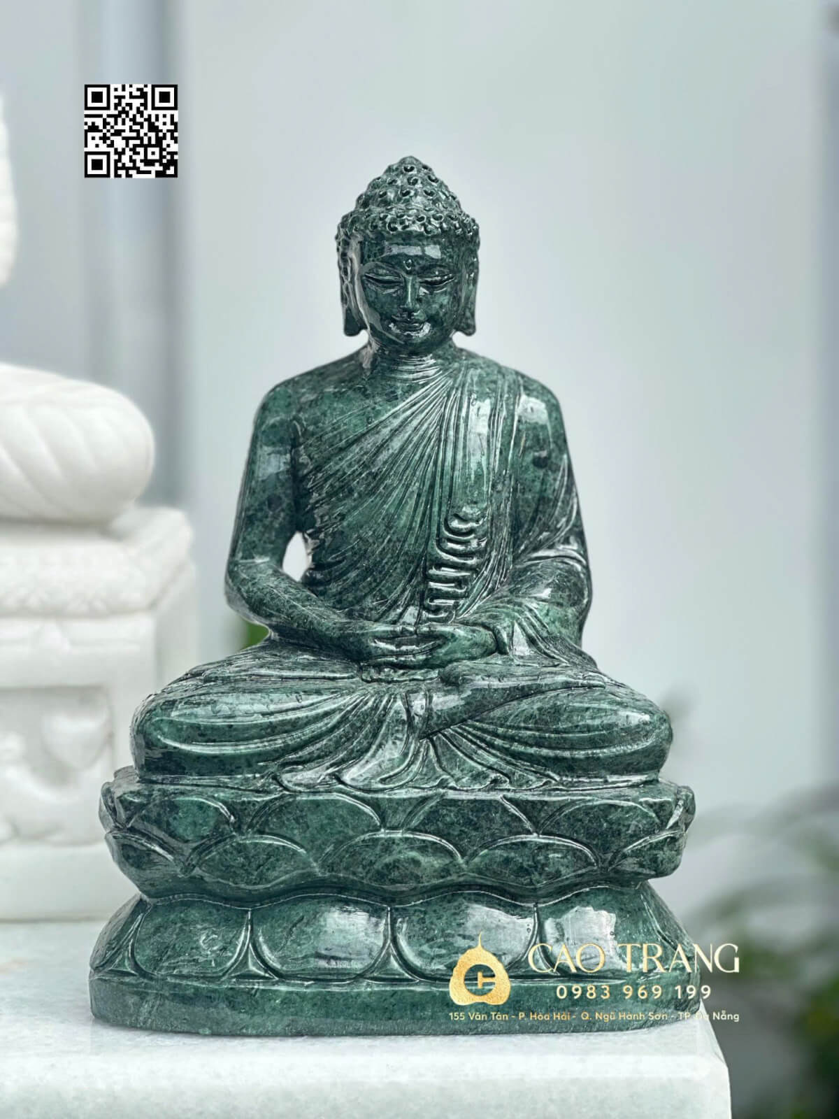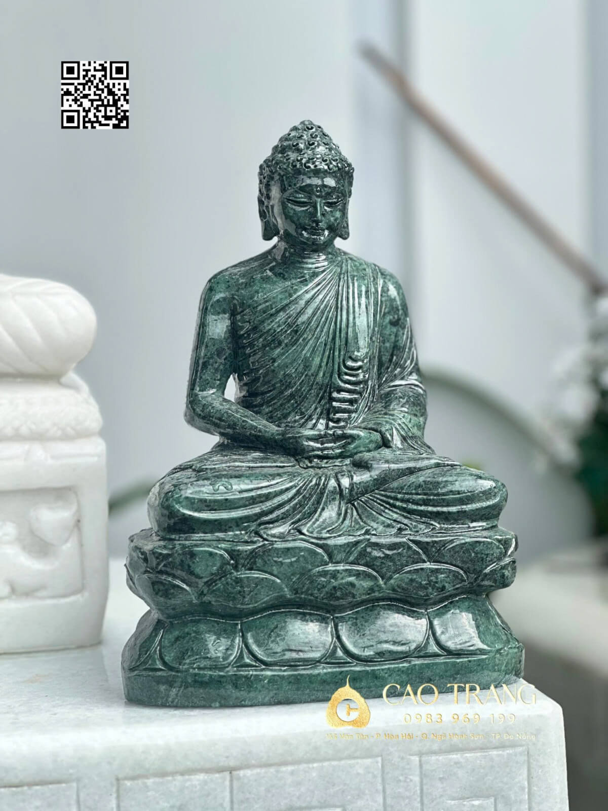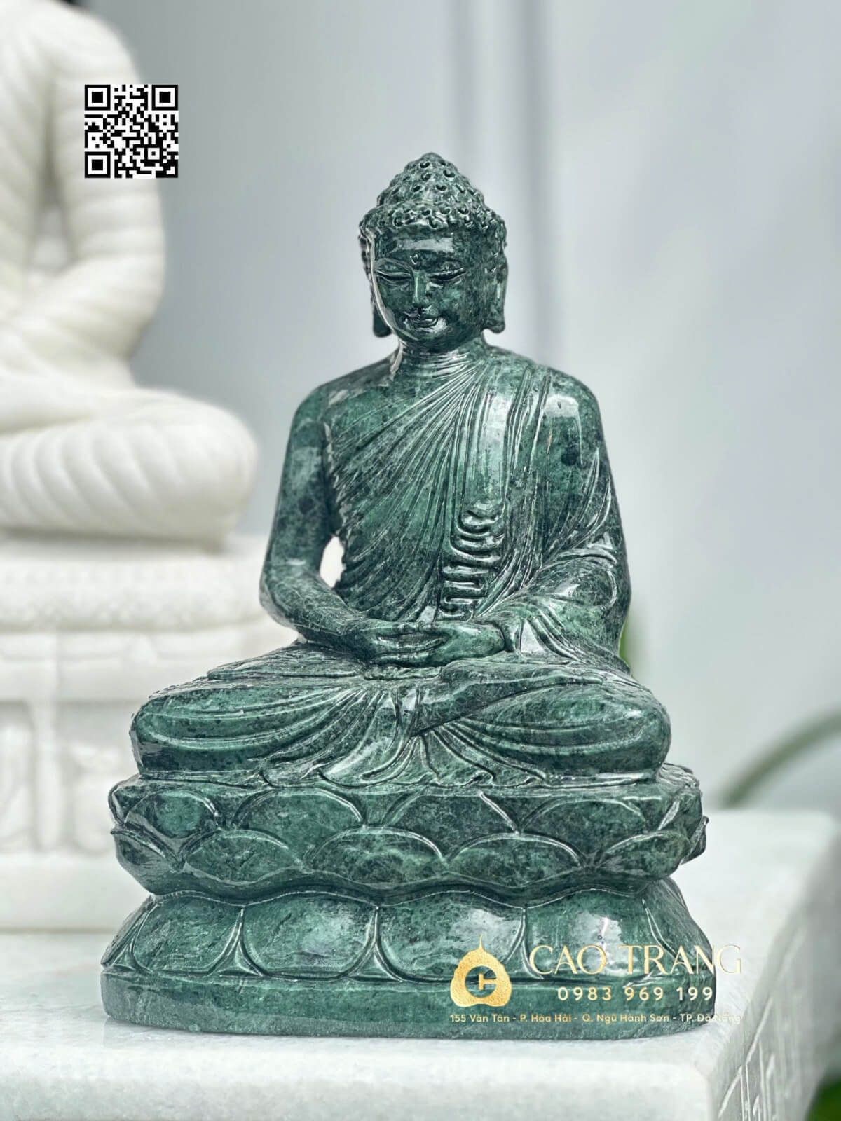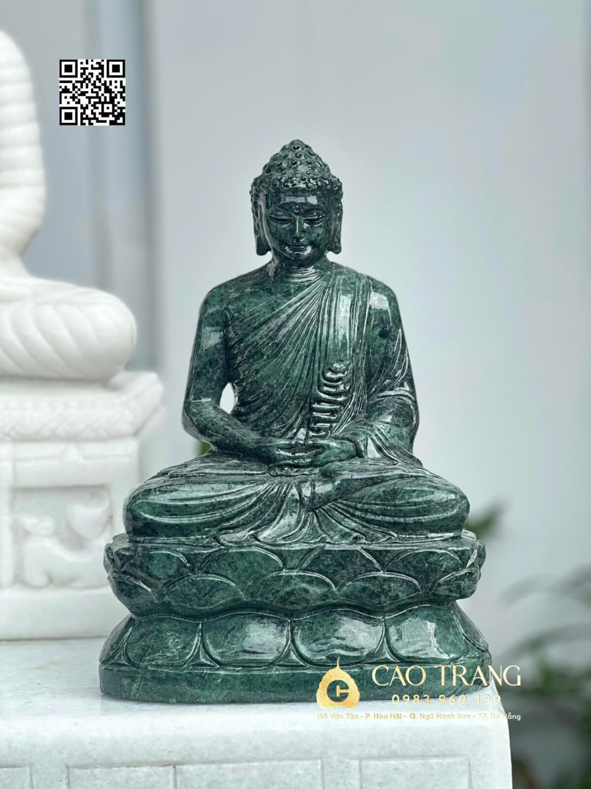 Sản phẩm được tạc từ đá xanh Ấn Độ tự nhiên nguyên khối, có độ cứng cao, vân đá đẹp và bền màu theo thời gian. Hình tượng Đức Phật Thích Ca ngồi kiết già trên tòa sen, hai tay thiền định, ánh mắt từ bi, gương mặt an nhiên, thể hiện trọn vẹn tinh thần chánh niệm và trí tuệ sáng suốt của Ngài.