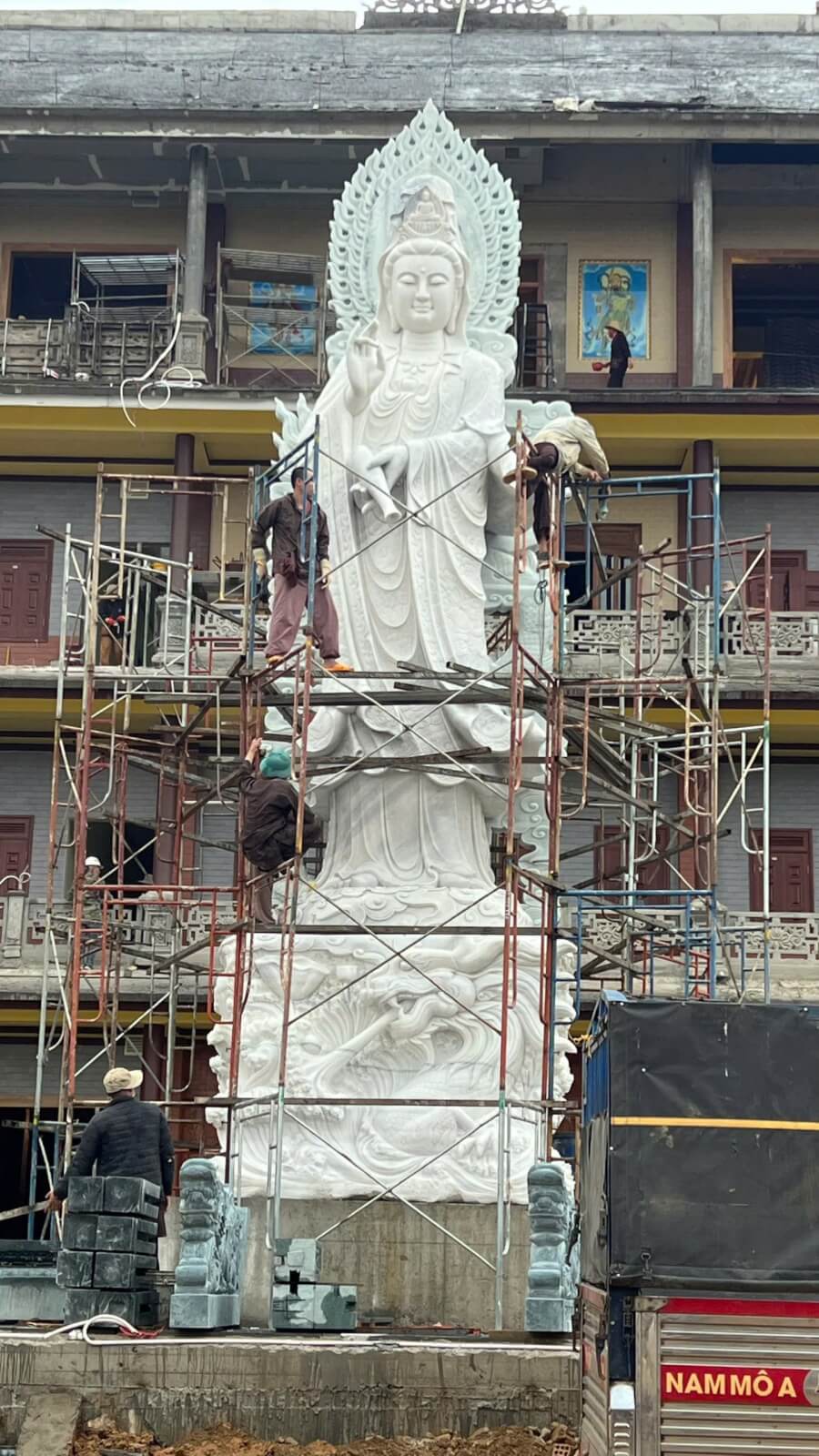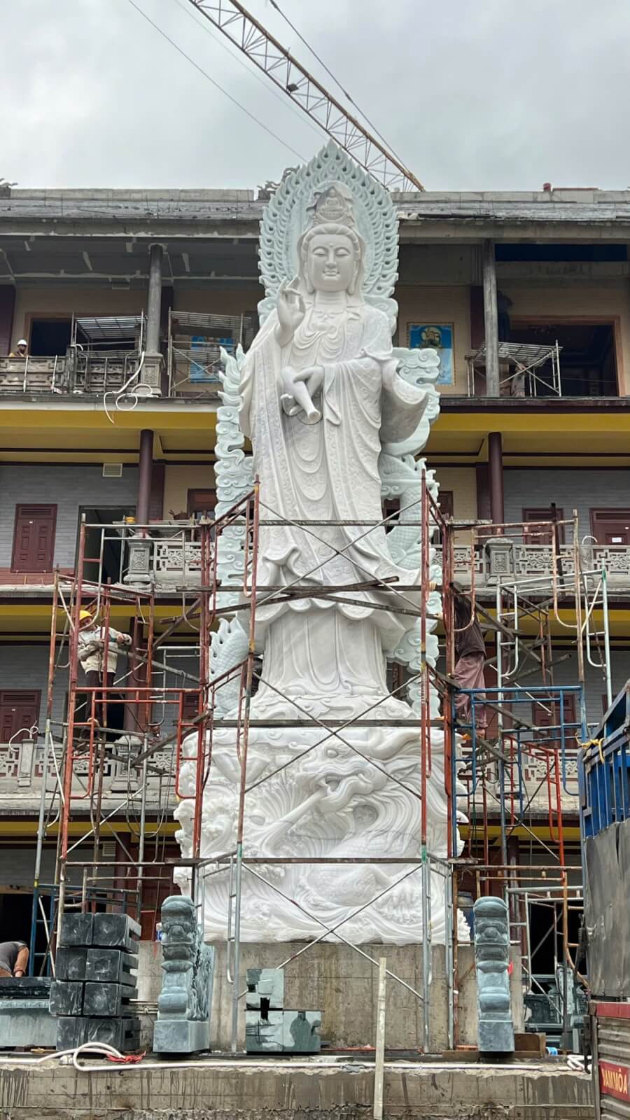 Thân tượng Quan Âm đứng: 7m – tướng hảo trang nghiêm, tay ấn, áo xiêm mềm mại.