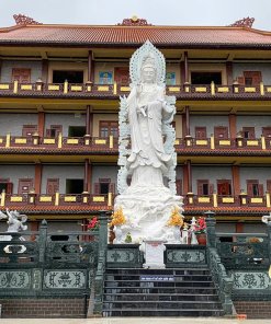 Tác phẩm Quan Âm Bồ Tát hào quang 10m được chế tác từ đá cẩm thạch trắng nguyên khối, chạm khắc thủ công bởi nghệ nhân làng đá Non Nước – Đà Nẵng. Chất đá tuyển chọn có độ bền, khả năng chịu mưa nắng và giữ màu tự nhiên lâu dài; quy trình chế tác thủ công giúp đường nét từ bi, thanh thoát và có “hồn” theo đúng mỹ thuật Phật giáo.