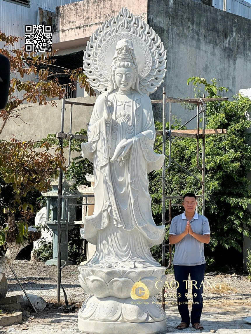 Pho tượng Phật Quan Âm đứng cao 4m5 được chế tác từ đá cẩm thạch trắng nguyên khối Nghệ An, dòng đá quý cao cấp, có vân sáng mềm, độ bóng tự nhiên và độ bền vượt thời gian.